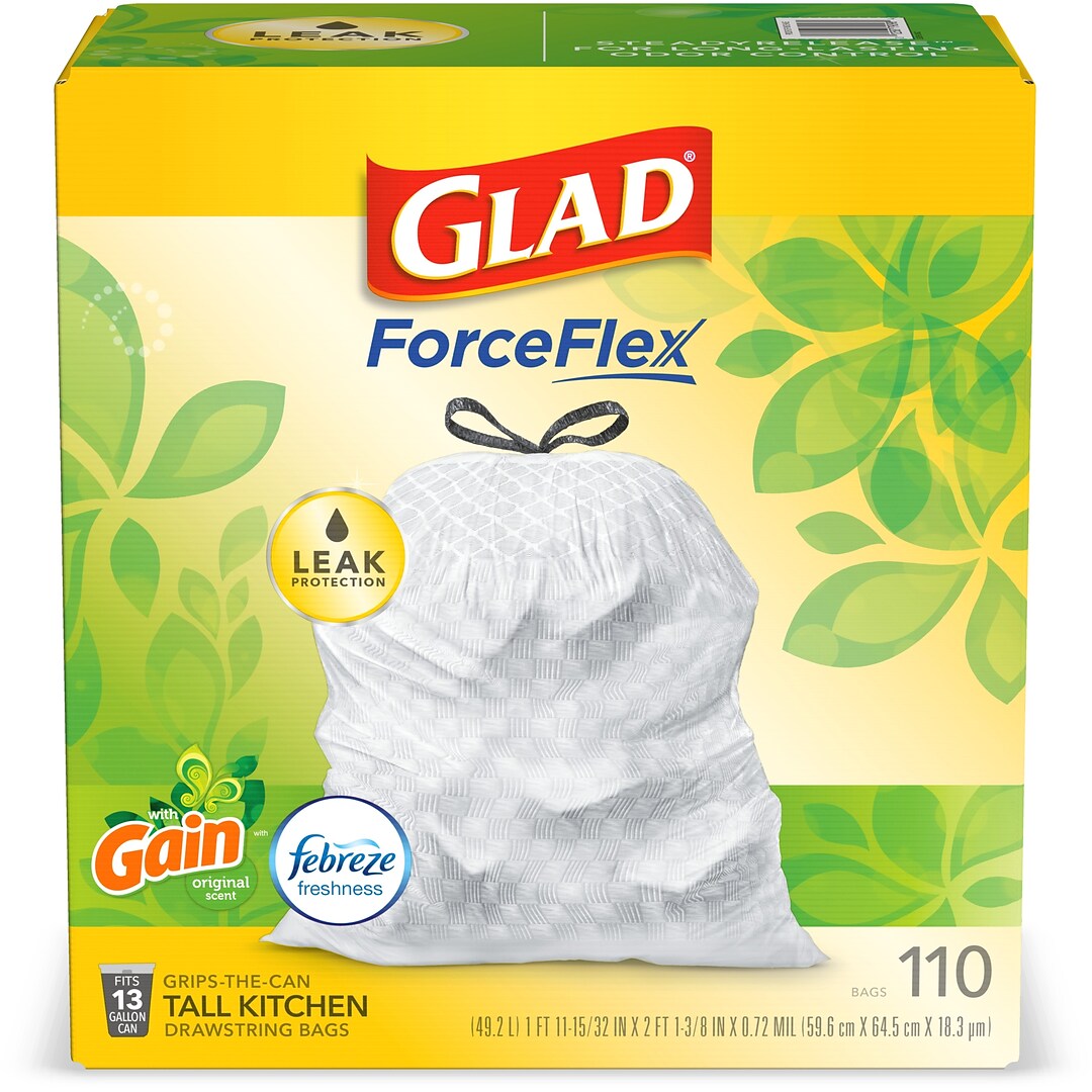 Glad forceflex tall kitchen drawstring trash bags 13 gallon white trash bag, gain island fresh scent with febreze freshness 50 count (package may vary) (package may vary) 4.7 out of 5 stars 49 $13.50 $ 13. 4.5 out of 5 stars with 1118 ratings. You can transport even the fullest garbage bag without any worries of spillage. Glad® food storage containers & trash bags is committed to making its website accessible for all users, and will continue to take steps necessary to ensure compliance with applicable laws. 4.7 out of 5 stars, based on 1530 reviews 1530 ratings current price $16.39 $ 16.